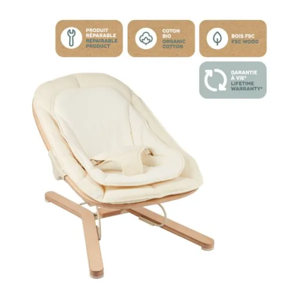 De Babymoov Swoon Flow is vervaardigd uit duurzame materialen zoals FSC-gecertificeerd beuken- en eucalyptushout. De zachte bekleding is gemaakt van biologisch katoen en gerecycled polyester, en is eenvoudig afneembaar en wasbaar. Dankzij de levenslange garantie van Babymoov kies je met vertrouwen voor kwaliteit en langdurig gebruiksgemak.