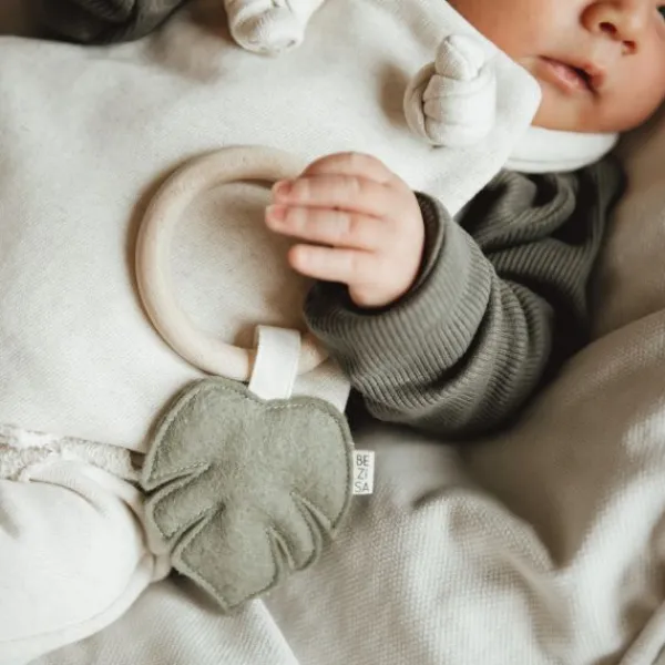 De BEZISA Leaves Bijtring Pistache Green bestaat uit een houten ring met een stoffen blaadje, waarop je kindje kan bijten. Hierdoor zal de pijn bij doorkomende tandjes verzacht worden. Het monsterablad is van binnen voorzien van knisperpapier, waar je kindje mee kan spelen. Door te spelen met en te bijten op het speeltje wordt de ontwikkeling van de fijne motoriek gestimuleerd. De producten van BEZISA zijn bewust gemaakt in neutrale kleuren, zodat je kindje niet overprikkeld wordt.