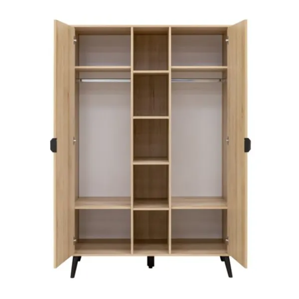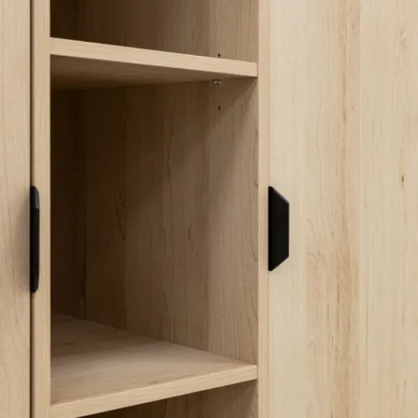 Achter elke deur bevindt zich een vaste legplank, een in hoogte verstelbare legplank en een in hoogte verstelbare hangroede, waardoor je de kast naar wens kunt indelen. In het midden van de kast zijn vier in hoogte verstelbare legplanken geplaatst, ideaal voor het opbergen van voorleesboeken, knuffels of decoratieve items. De deuren zijn uitgerust met een softclose-mechanisme, wat zorgt voor geruisloos en veilig sluiten.