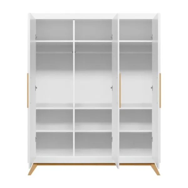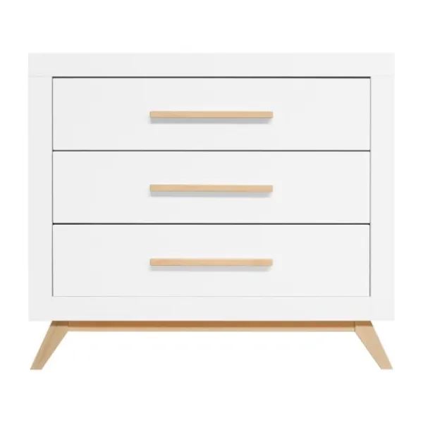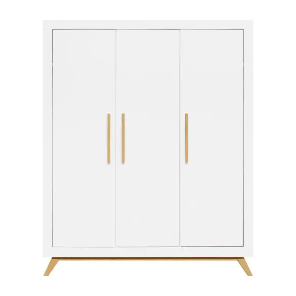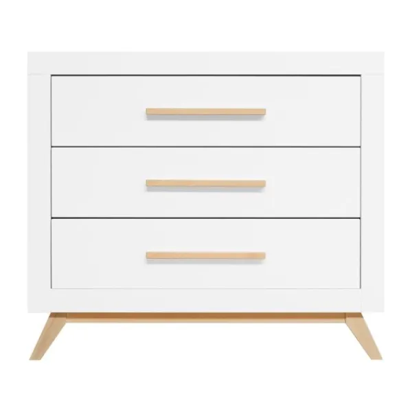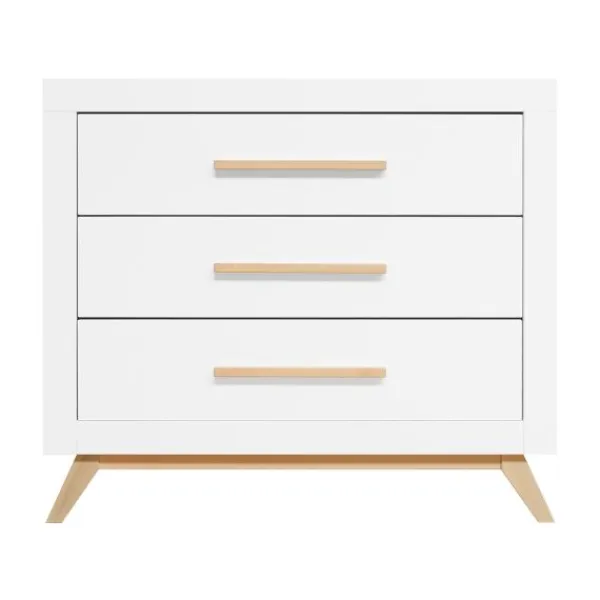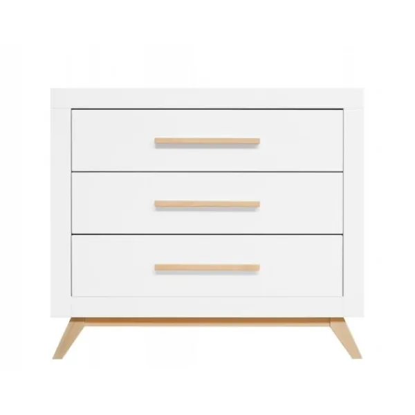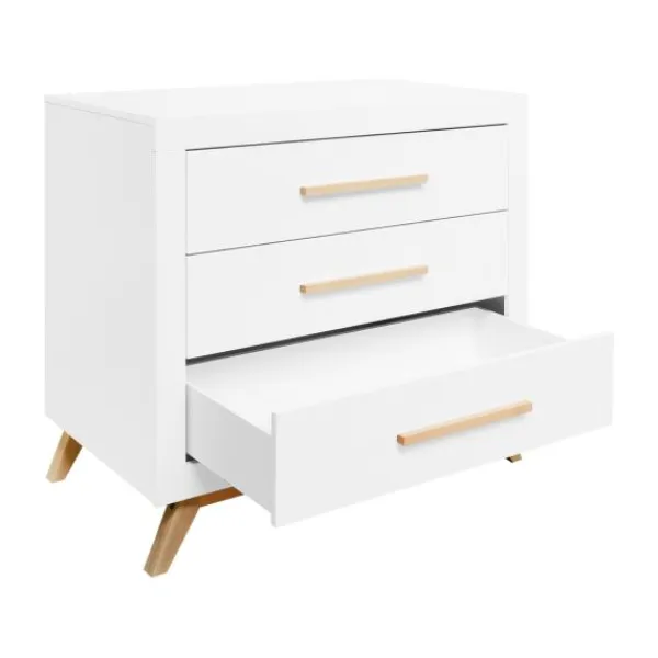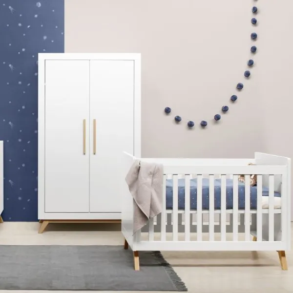 De Fenna babykamer kenmerkt zich aan de beukenhouten onderstel met schuine poten en de strakke handgrepen in deze kleur. De beukenhouten kleur is verder gecombineerd met wit. De laden van de commode beschikken over een soft-close systeem zodat het meubel niet gauw beschadigd. Het is een babykamer in een Scandinavische look!