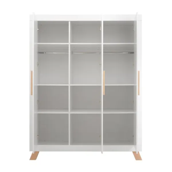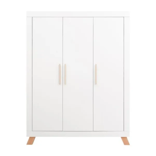 Het bed heeft een minimalistisch ontwerp met schuine poten en een mix van wit en naturel hout, typisch voor de Lisa‑serie. Zo past het moeiteloos in moderne kinderkamers. De kast is ruim opgezet en dankzij de drie deuren en meerdere hang‑ en legruimte ideaal om alles netjes en overzichtelijk op te bergen — van winterjassen tot pyjama’s.