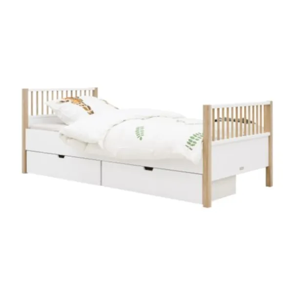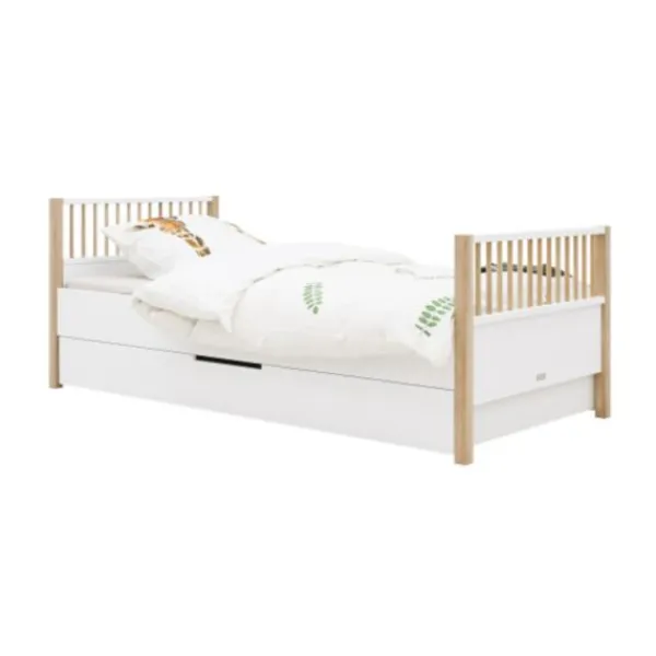 Het Bopita Mika Bed Wit / Eiken 90 x 200 cm kenmerkt zich door de eiken accenten. Verder is het bed gemaakt van hoogwaardig materiaal en afgewerkt met een lak op waterbasis waardoor het kind- en milieuvriendelijk is. Daarnaast wordt het bed geleverd inclusief lattenbodem en exclusief matras. Het is ook mogelijk om een uitvalbeshermer te plaatsen. Onder het bed is ruimte voor de Corsica bedlade, ideaal om speelgoed en allerlei andere spulletjes in op te bergen.