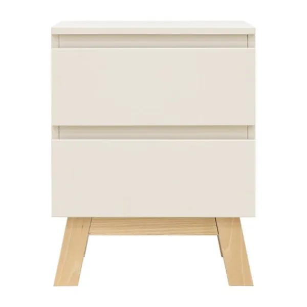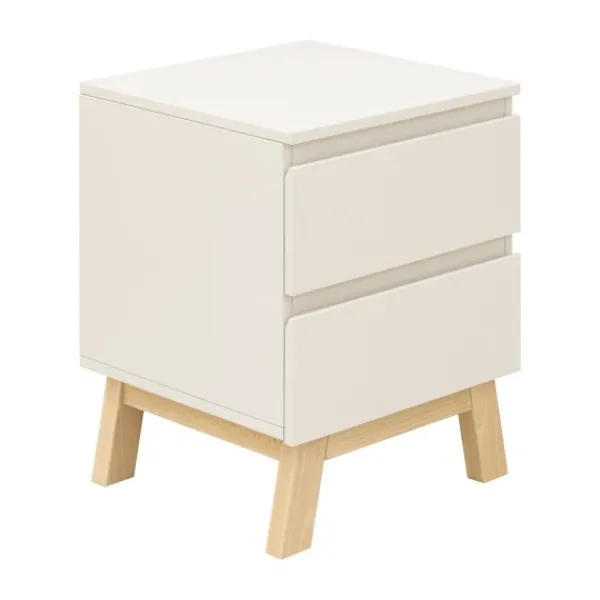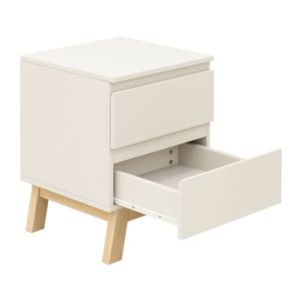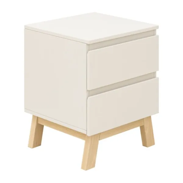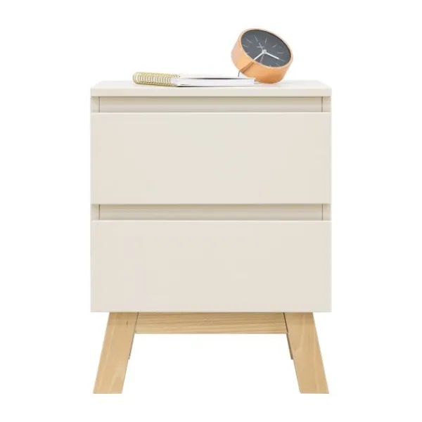 Het bed heeft een stevig frame met schuine massief beukenhouten poten en wordt geleverd inclusief een lattenbodem. Het bijpassende nachtkastje beschikt over een lade met softclose systeem en een open vak voor boeken of accessoires. Ideaal naast het bed voor nachtlampje, glas water of favoriete spullen.
