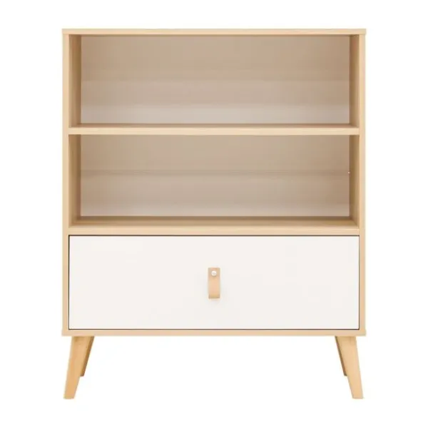 Deze ladekast is voorzien van een ruime lade en een open vak erboven, ideaal voor het opbergen van kleding, speelgoed of boeken. De lade is uitgerust met een stoere leren lus als handgreep, wat niet alleen functioneel is maar ook bijdraagt aan het moderne design. Dankzij de compacte afmetingen is de kast geschikt voor zowel baby- als tienerkamers.