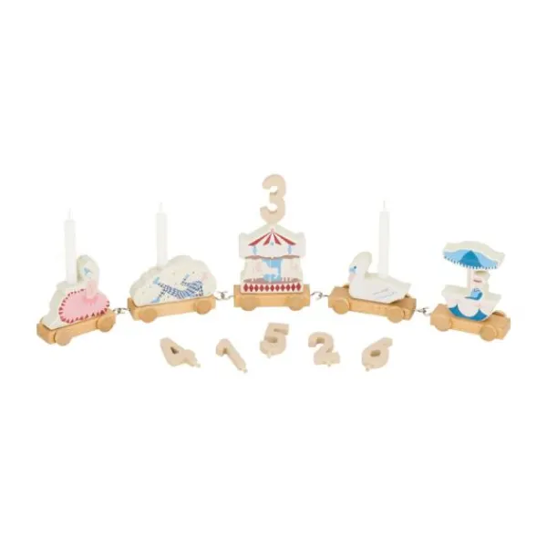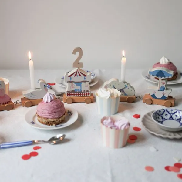 Vier elke kinderverjaardag op een betoverende manier met de Cam Cam Copenhagen Verjaardagstrein – Carousel. Deze prachtige houten trein is gemaakt van FSC-gecertificeerd hout en met de hand geschilderd in zachte kleuren. De trein bestaat uit vijf herkenbare figuren uit het geliefde Dreamland-thema, zoals een carrousel, zwaan en boot, en vormt een sfeervolle eyecatcher op de feesttafel. De trein wordt geleverd met houten cijfers van 1 tot 6, zodat je hem elk jaar opnieuw kunt gebruiken. De wagentjes zijn met metalen haakjes aan elkaar te koppelen, waardoor je de opstelling makkelijk kunt aanpassen. Een tijdloos aandenken dat zorgt voor verwondering en warme herinneringen op elke verjaardag.