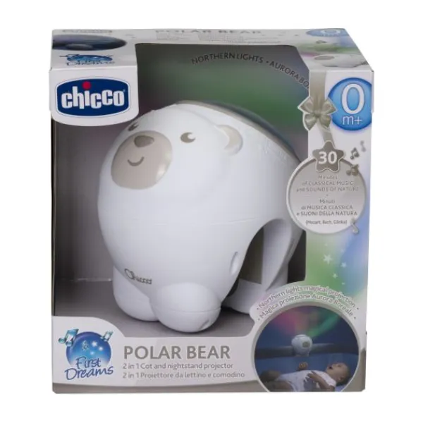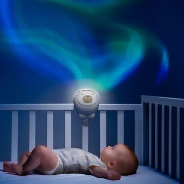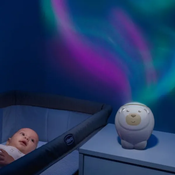 Met de Chicco IJsbeer Projector – Beige verander je de babykamer is een echte droomwereld. De vrolijke projector vult het plafond met het prachtige noorderlicht in verschillende kleuren en zorgt voor een rustgevende slaapomgeving voor je kindje. Vooraf kan de projector worden ingesteld door middel van een timer, zodat je kindje rustig in slaap kan komen. Bovendien beschikt deze projector over verschillende melodieën. De projector heeft een compact en draagbaar ontwerp, waardoor je hem overal in de kamer kunt neerzetten. Ook is het mogelijk om de schattige ijsbeer over de rand van het bedje te bevestigen. Zo kan je kindje altijd ontspannen in slaap vallen met deze projector in de buurt.