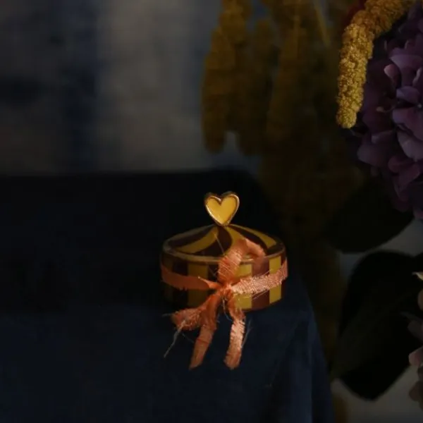 Het Pyar Hart Circusdoosje van Doing Goods is een speels en liefdevol opbergdoosje met een vrolijk streeppatroon in geel en bordeaux. De deksel is versierd met een hartvormige knop – perfect voor het bewaren van sieraden of kleine herinneringen. Handgemaakt in India van 60% gerecycled messing en 40% resin, waardoor elk doosje uniek is. Een kleurrijk en charmant accent op je kaptafel of nachtkastje, en ook een mooi cadeau met betekenis.