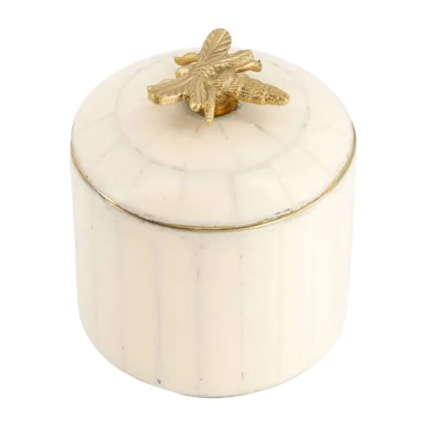 Het Doing Goods Queen Bee Circusdoosje is een elegant opbergdoosje met een speelse touch. De deksel is voorzien van een gedetailleerd bijtje van messing en geeft dit ronde doosje een charmant karakter. De crèmekleurige buitenkant en gouden binnenzijde maken het perfect voor het stijlvol opbergen van wattenschijfjes, sieraden of andere kleine spulletjes. Gemaakt van 60% gerecycled messing en 40% resin, en volledig met de hand vervaardigd in India. Door het ambachtelijke proces is elk exemplaar uniek en draagt het bij aan een eerlijkere wereld. Een prachtige blikvanger voor op je badkamer, dressoir of kaptafel.