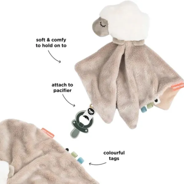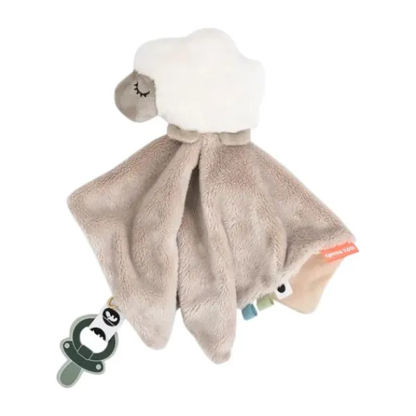Het Done By Deer Knuffeldoekje – Tiny Farm – Sheepy Sand Is Heerlijk Zacht En Ideaal Voor Knuffelmomenten. Met Het Klittenbandlusje Bevestig Je Gemakkelijk Een Fopspeen. De Lieve Schaapvorm En Kleurrijke Labels Prikkelen De Zintuigen En Geven Troost.
