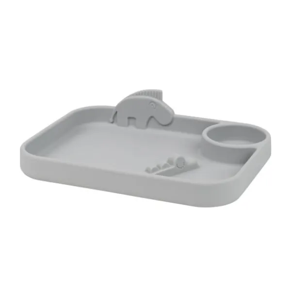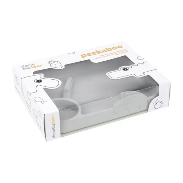 Het stijlvolle Done by Deer Peekaboo Friends Bord Grey is een bord met verschillende vakjes, waardoor je het eten kunt scheiden. Het bord is gemaakt van 100% silicone waardoor het anti slip is en dus niet makkelijk van tafel geduwd kan worden. Doordat het bordje flexibel is zal het niet snel kapot gaan. Het bord beschikt over drie vakken waar verschillend eten opgeschept kan worden. Het is een erg praktisch bord wat je kindje helpt met eenvoudig zelfstandig eten.
