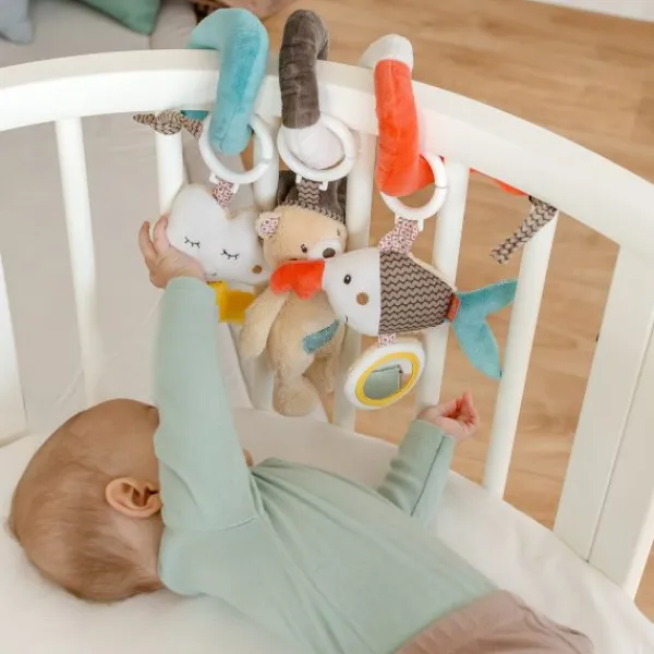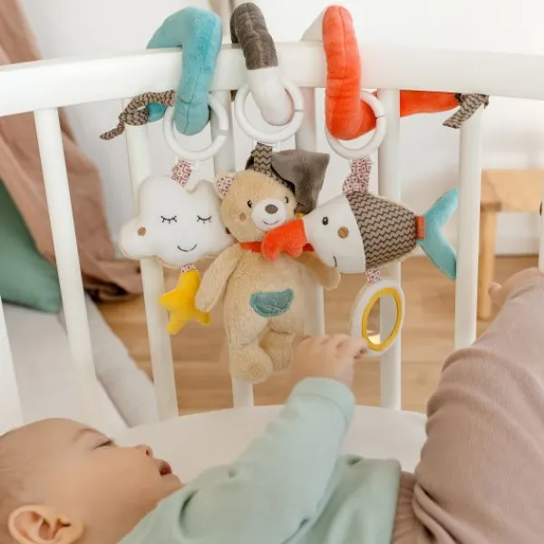 De Fehn Activity Spiraal – Bruno – Multikleur zorgt voor eindeloos speelplezier en stimuleert de ontwikkeling van je baby. De spiraal is voorzien van drie zachte speelfiguurtjes, waaronder een beertje, wolkje en visje met spiegeltje. Ze nodigen uit tot grijpen, ontdekken en stimuleren de oog-handcoördinatie. Dankzij de flexibele spiraalvorm wikkel je het speeltje eenvoudig om een box, wieg, kinderwagen of autostoel. De figuurtjes zijn verschuifbaar, zodat je ze op de perfecte plek kunt positioneren voor je kindje. Ideaal voor thuis én onderweg!