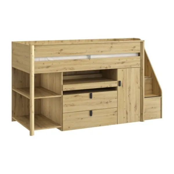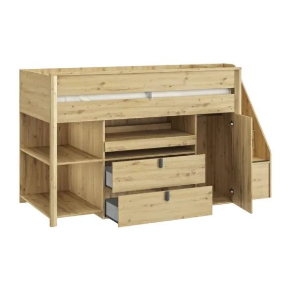 De praktische indeling van het combibed maakt het ideaal voor kleinere ruimtes. Onder het verhoogde bed bevindt zich een functioneel geheel van opbergmogelijkheden, met onder andere twee ruime lades, een kast met deur, en meerdere open vakken voor boeken of speelgoed. De trap aan de zijkant biedt niet alleen een veilige instap, maar bevat ook extra opbergruimte in de treden – ideaal voor schoenen of kleinere items.