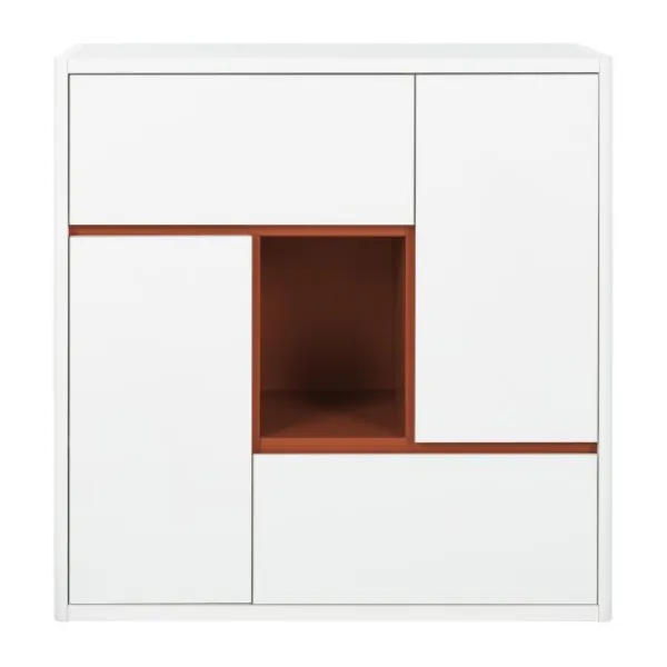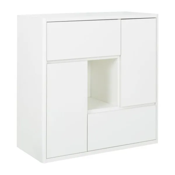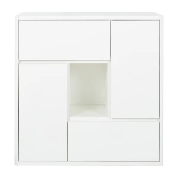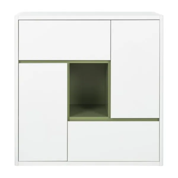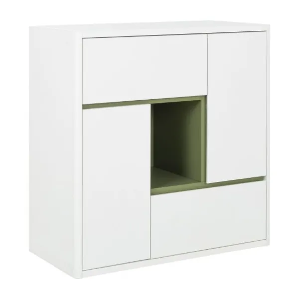 De speelse, asymmetrische indeling bevat meerdere gesloten vakken en een open compartiment in eikenhout-look. Dit open vak is ideaal om een favoriet item zoals een knuffel, boek of decoratiestuk in het zicht te plaatsen. De gesloten opbergvakken zorgen ervoor dat speelgoed, kleding of andere spulletjes netjes uit het zicht opgeborgen kunnen worden.