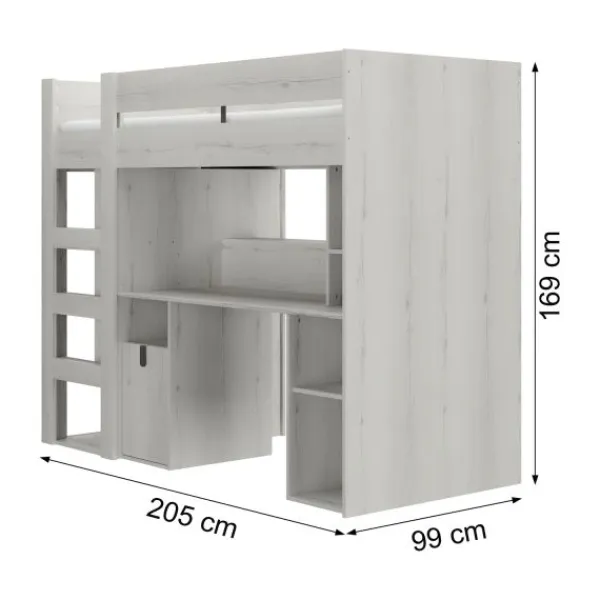 Onder het slaapgedeelte bevindt zich een ruim bureau met open schappen en een kastje, ideaal voor huiswerk, knutselspullen of schoolboeken. Aan de zijkant van het bed is een geïntegreerde kledingkast geplaatst met praktische legplanken. De stevige, brede trap zorgt voor een veilige toegang tot het bed en biedt extra open vakken aan de zijkant voor schoenen, speelgoed of decoratie.