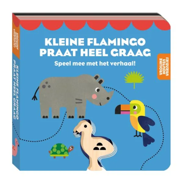 Maak kennis met *Kleine flamingo*, het vrolijke hoofdpersoon uit dit stevige kartonboekje van Imagebooks. Dit boekje is onderdeel van de serie “Vrolijke houten vriendje” en bevat een speelse houten vingerpop waarmee je kindje tijdens het voorlezen actief kan meedoen. Kleine flamingo praat heel graag en neemt je kindje mee in een herkenbaar en vrolijk verhaaltje over kletsen, delen en ontdekken.