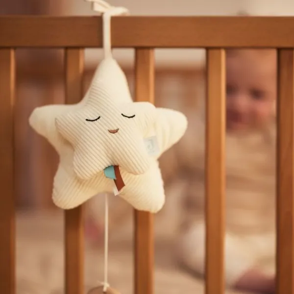 De muziekhanger is voorzien van kleurrijke koordjes en schattige geborduurde oogjes, wat zorgt voor een speels en lief detail. Dankzij het zachte materiaal is deze ster niet alleen een prachtige decoratie, maar ook fijn om naar te kijken en te ontdekken. Ideaal om op te hangen bij het bedje, de box of de kinderwagen!