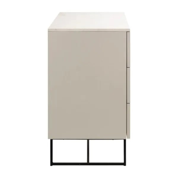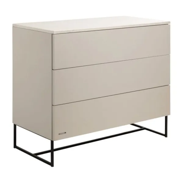 Deze uitvoering van de Kidsmill Intense Commode heeft drie ruime lades en een zwart, stalen onderstel. De commode is gemaakt van hoogwaardig materiaal en is erg praktisch in gebruik dankzij het push-to-open systeem waarmee de lades zijn uitgerust. Hierdoor kun je de lades heel gemakkelijk openen en zonder geluid sluiten. De commode is verkrijgbaar in combinatie met verschillende commodebladen. Deze uitvoering beschikt over een marmeren bovenblad in de kleur warm sand. Dit bovenblad geeft de commode gelijk een chique en warme uitstraling.