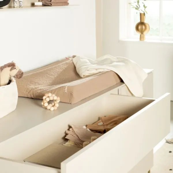 De Kidsmill Commode XL – Intense II – Oatmeal / Patinated Brass is een stijlvolle en praktische toevoeging aan iedere babykamer. Deze ruime commode biedt niet alleen veel opbergruimte dankzij de drie extra grote lades, maar voegt ook een vleugje luxe toe met het elegante stalen onderstel in patinated brass afwerking. Het moderne design in de zachte kleur Oatmeal past moeiteloos in diverse interieurstijlen, van Scandinavisch tot klassiek. De lades zijn voorzien van een handig push open systeem, waardoor ze met een lichte aanraking moeiteloos en geruisloos openen. Dit zorgt voor extra gebruiksgemak, vooral wanneer je je handen vol hebt met je kindje. De commode is vervaardigd uit hoogwaardig materiaal dat garant staat voor duurzaamheid en een lange levensduur. Dankzij het royale formaat is deze commode uitermate geschikt voor gebruik met een aankleedkussen, waarbij je nog steeds voldoende ruimte overhoudt voor verzorgingsproducten en accessoires. Bovendien laat deze commode zich perfect combineren met andere meubels uit de Kidsmill Intense serie voor een harmonieus geheel in de babykamer.