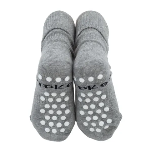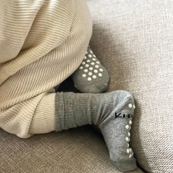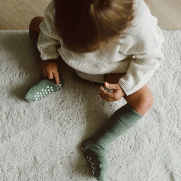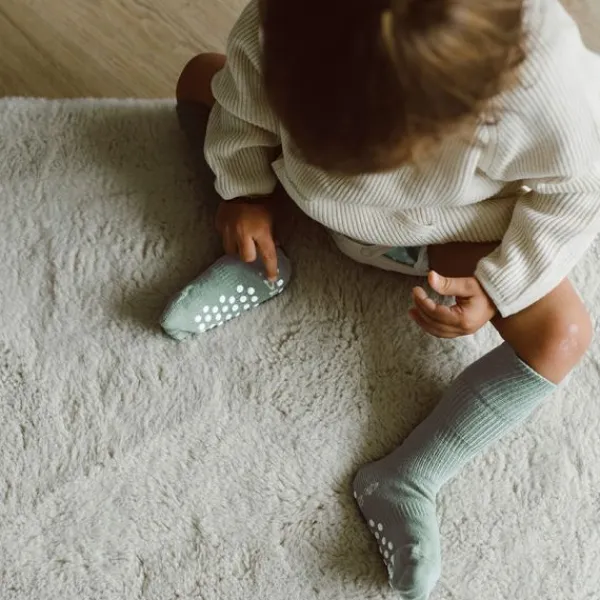 De antislip-zool biedt grip bij het lopen en is gemaakt van milieuvriendelijke inkt die minder stof aantrekt dan siliconen. De sokjes zijn gemaakt van zacht biologisch katoen (GOTS) en wasbaar op 30°C. Droog ze aan de waslijn en rek ze na het drogen even uit.