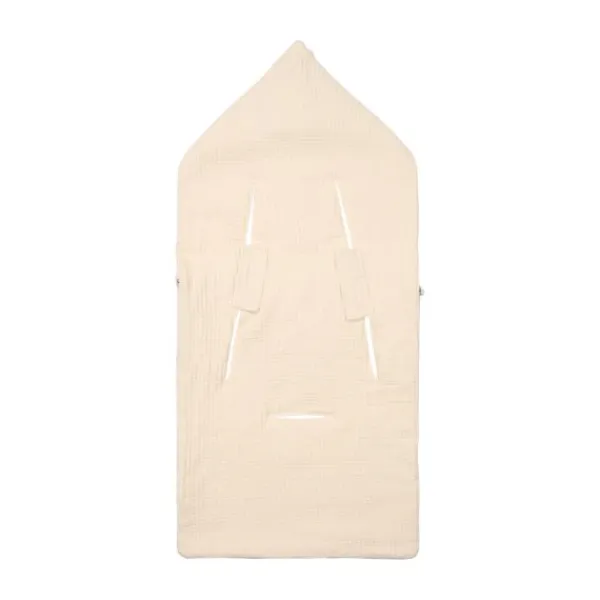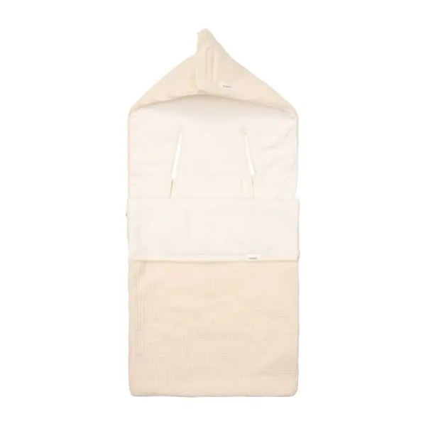 De voetenzak is voorzien van handige **gordelopeningen**, waardoor hij eenvoudig in een autostoeltje met een 3- of 5-puntsgordel past. De bovenkant kan worden omgevouwen tot een schattige capuchon, zodat het hoofdje van je baby lekker warm blijft. Dankzij de ritssluiting is de voetenzak gemakkelijk te openen en te sluiten.