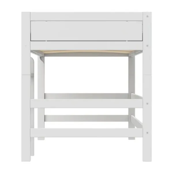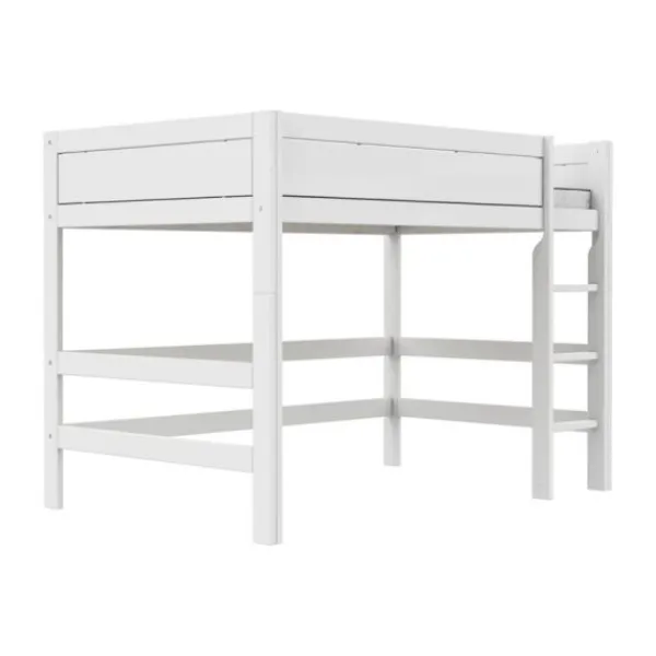 Onder het verhoogde bed is voldoende ruimte voor een bureau, speelhoek of opbergmeubel. Het bed wordt geleverd met een **luxe lattenbodem** voor optimale ondersteuning en comfort. De stevige ladder is links of rechts te monteren, zodat het bed zich eenvoudig aanpast aan de kamerindeling. Een praktische en stijlvolle keuze voor iedere kinderkamer.