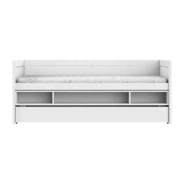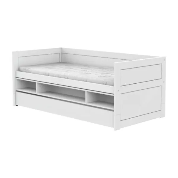 Het bed wordt geleverd inclusief een ruime bedlade en een handige opbergmodule onder het bed. Deze diepe lade is perfect voor het opbergen van speelgoed, boeken of beddengoed. Wil je een extra slaapplek creëren voor logees? Voeg dan eenvoudig een lattenbodem en matras toe en gebruik de lade als comfortabel logeerbed — ideaal voor vriendjes of familie die blijven overnachten.