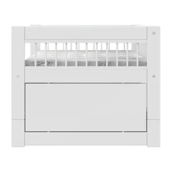 Dankzij de verhoogde constructie (44 cm hoogte onder het bed) benut je de ruimte onder het bed optimaal, terwijl het bed zelf een veilige en comfortabele plek biedt om te slapen of te ontspannen. Het is vervaardigd van duurzaam grenenhout en afgewerkt in een frisse witte lak voor een tijdloze uitstraling.