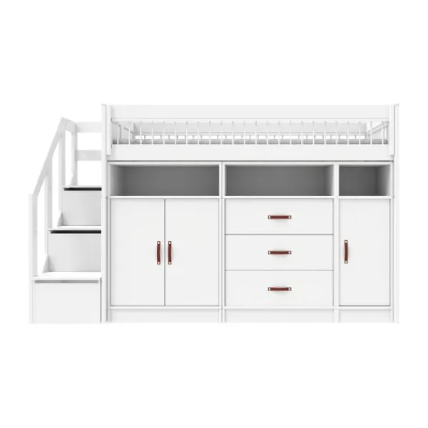 De LifeTime Breeze Lage Hoogslaper – All-In-One – Rolbodem is een praktische oplossing voor wat kleinere kamers. Onder het slaapgedeelte bevind zich een uitgebreid opbergsysteem dat kan dienen als kledingkast. Door middel van de trap kan je kindje in bed klimmen. De handgrepen zijn niet inbegrepen, dus je kan zelf kiezen welke handgreep je mooi vindt. Deze hoogslaper is onderdeel van de Breeze collectie. Deze collectie kenmerkt zich door het open design met spijlen aan de bedzijkanten en rugleuning van het bed.