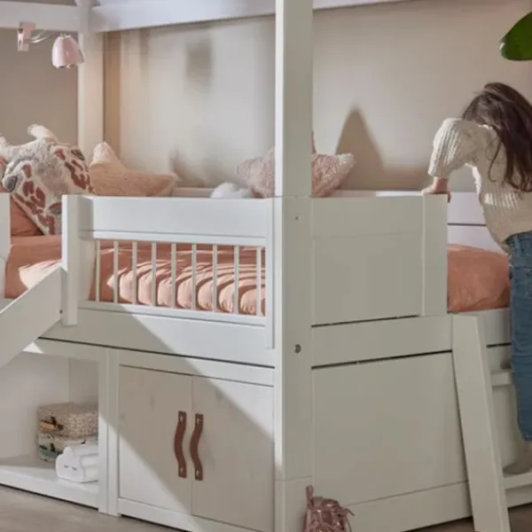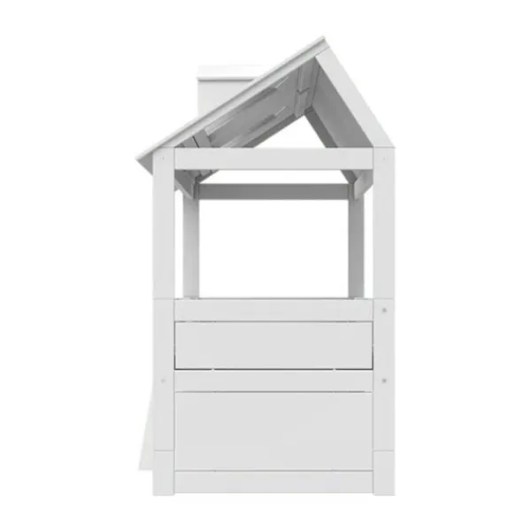 Het bed is gemaakt van hoogwaardig massief grenenhout en wordt geleverd met een stevige premium rolbodem voor optimaal ligcomfort. De toegang tot het bed is eenvoudig via het meegeleverde trapje of de optionele glijbaan, wat het in- en uitstappen extra leuk maakt. De reling rondom de slaapruimte zorgt voor veiligheid tijdens het slapen en spelen. Dit bed is niet alleen een plek om te rusten, maar ook een speelhuisje dat de creativiteit van je kind stimuleert.