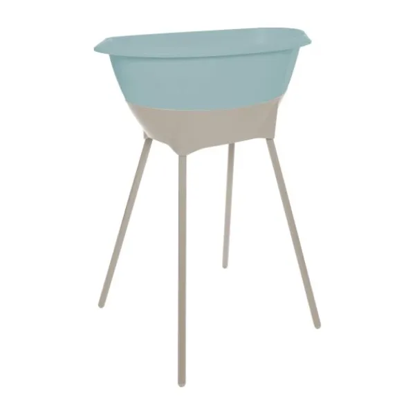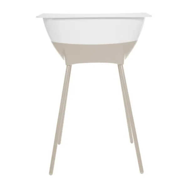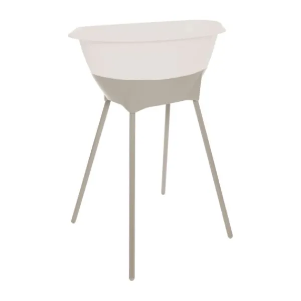 De bijpassende badstandaard in dezelfde Almond-kleur brengt het badje op een comfortabele werkhoogte. Dit voorkomt onnodig bukken en zorgt voor een rugvriendelijke houding tijdens het badderen. Dankzij het stevige kliksysteem staat het badje stabiel op zijn plek. Na gebruik klik je de poten eenvoudig los, zodat je de set compact kunt opbergen — ideaal voor kleinere ruimtes.