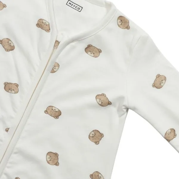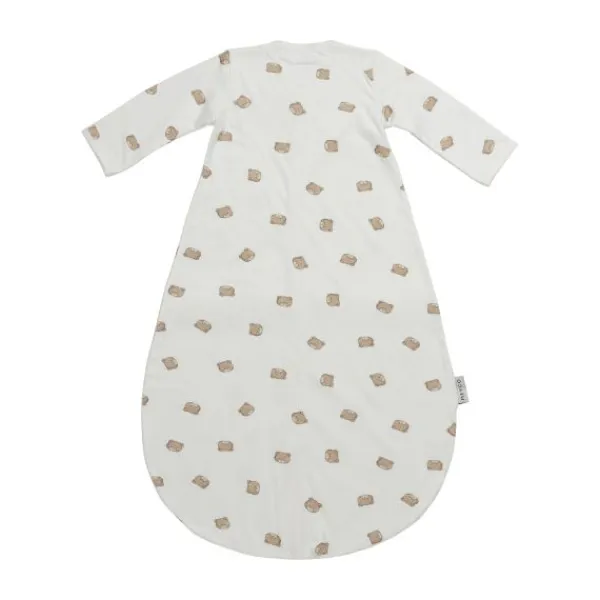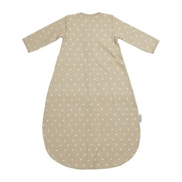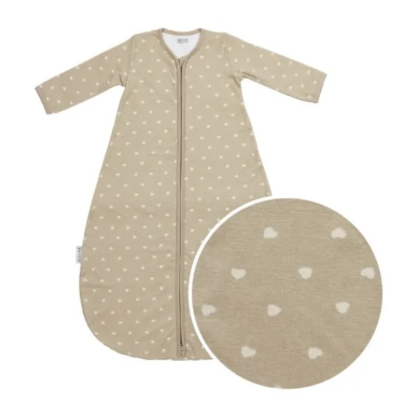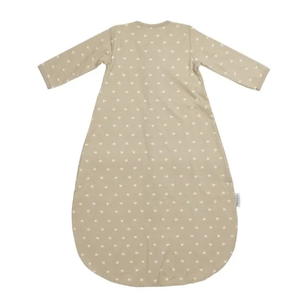 De lange rits aan de voorkant maakt aan- en uitdoen eenvoudig. Het subtiele hartjesmotief in zandkleur geeft de slaapzak een lieve uitstraling die bij elke babykamer past.
