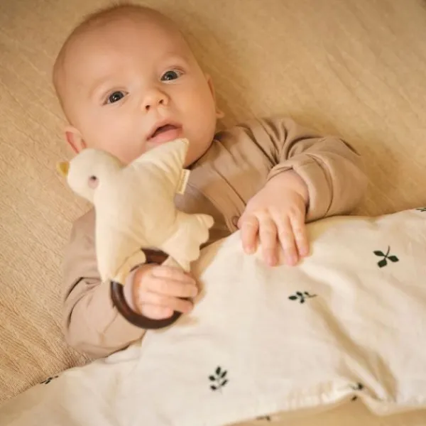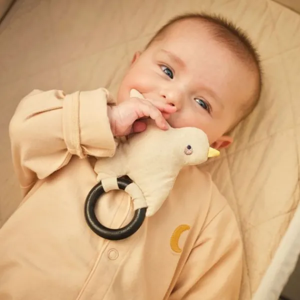 De Moonboon Rammelaar – Vogel is een betoverend eerste speeltje voor je baby, met een zachte vogel en een gladde houten ring die perfect is voor kleine handjes. Het subtiele belletje binnenin stimuleert de zintuigen en nodigt uit tot ontdekking en spel. Ideaal om de fijne motoriek en nieuwsgierigheid van je kleintje te bevorderen vanaf de geboorte. Gemaakt van 100% biologisch katoen en een stevige houten ring van dennenhout, combineert deze rammelaar veiligheid, duurzaamheid en eenvoud. Het compacte formaat maakt hem perfect voor thuis of onderweg, en dankzij het CE-keurmerk kun je met een gerust hart laten spelen.