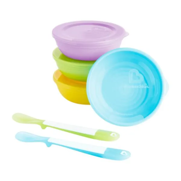 Met deze Munchkin 10-delige set kan je kindje zelfstandig leren eten. De schaaltjes zijn erg handig voor de eerste vaste voeding van je kindje. Je kunt de deksels en schaaltjes onderling verwisselen zodat je een vrolijke kleurencombinatie krijgt. De set is gemaakt van hoogwaardig en duurzaam materiaal dat wel tegen een stootje kan.