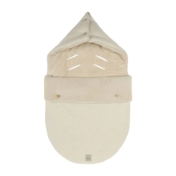 Dankzij de voorgevormde gordelopeningen is de voetenzak eenvoudig te bevestigen in een 3- of 5-puntsgordelsysteem. De capuchonvormige bovenkant beschermt het hoofdje tegen tocht, en met de handige knopen kun je de bovenrand eenvoudig omslaan. Een combinatie van comfort, functionaliteit en een rustige, natuurlijke uitstraling.