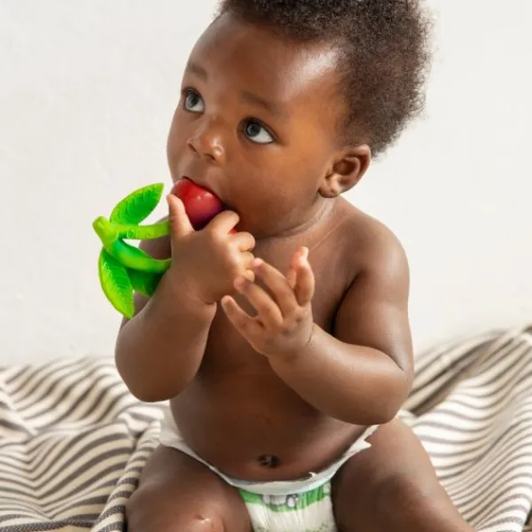 Op dit Oli & Carol Mery The Cherry Bijtspeeltje kan je kindje heerlijk bijten. Het bijtspeeltje heeft een ergonomische vorm waardoor je kindje hem makkelijk zelf kan vasthouden. Het verzacht het tandvlees bij doorkomende tandjes. Het leuke bijtspeeltje is gemaakt van natuurlijk rubber en op een milieuvriendelijke manier geproduceerd.