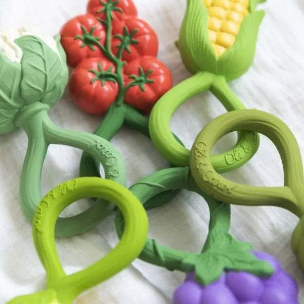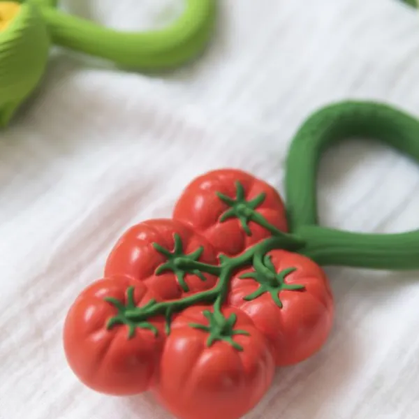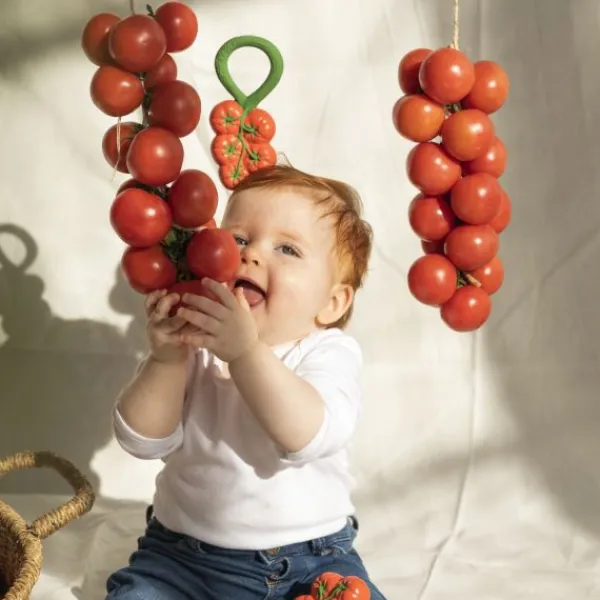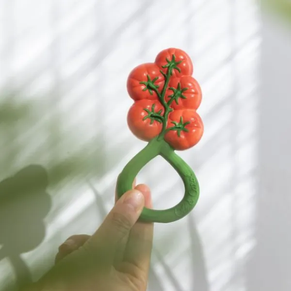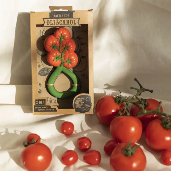 De Oli & Carol Rammelaar – Tomaat is een 2-in-1 bijtspeeltje en rammelaar, gemaakt van 100% natuurlijk rubber en gevuld met gerecyclede kersenpitten. Het zachte materiaal is veilig voor doorkomende tandjes en stimuleert de zintuigen van je kindje. Ontwikkeld met KNO-artsen voor een rustgevend geluid dat kalmeert zonder te overstimuleren. Dankzij het ronde ontwerp is de rammelaar gemakkelijk vast te houden en mee te nemen. Vrij van plastic, gaatjes en schadelijke stoffen: veilig en hygiënisch!