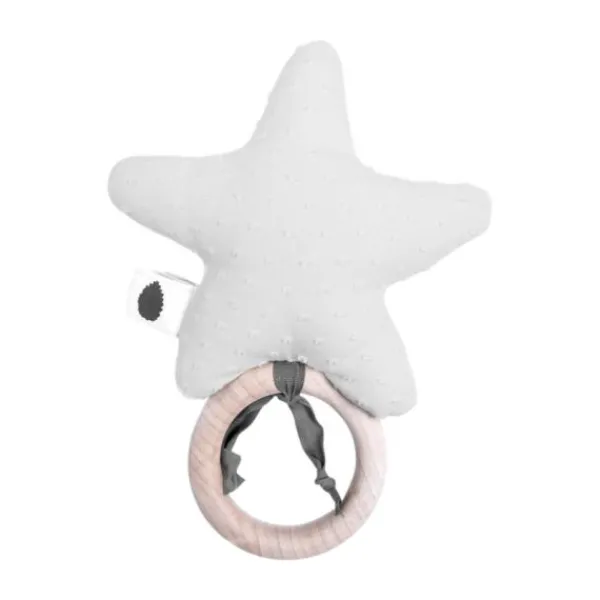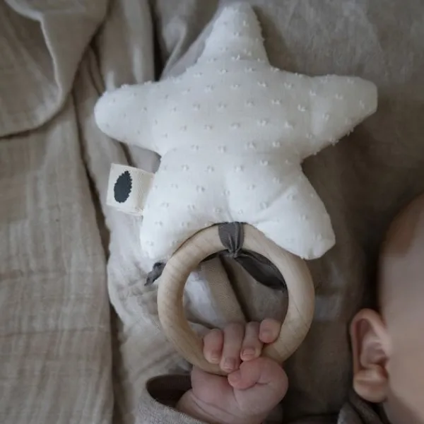 De Pine Cone Ellie Ster Rammelaar – Cloud is een prachtig eerste speeltje voor je baby. Deze schattige rammelaar in de vorm van een ster, maakt een zacht rammelgeluid dat de aandacht van je kleintje trekt. Dankzij de houten ring, kan je baby het speeltje gemakkelijk vasthouden, wat perfect is om de fijne motoriek te ontwikkelen. Gemaakt van biologisch katoen en gevuld met OEKO-TEX gecertificeerd polyester, is dit een veilig en duurzaam speeltje. Kortom, een echte musthave voor je kleintje!