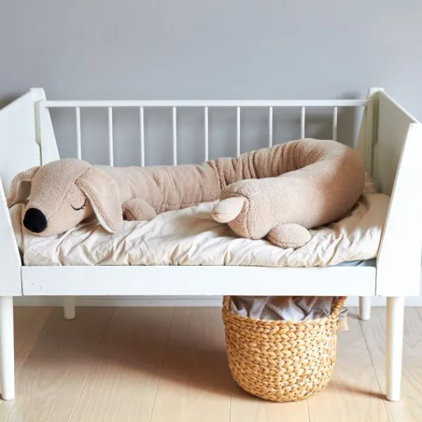 Het Roommate Kussen – Long Dog – Sherpa is een zacht en multifunctioneel kussen in de vorm van een schattige teckel. Dankzij het lange ontwerp is dit kussen perfect als bedbumper, speelkameraadje of decoratie in de kinderkamer. Gemaakt van heerlijk zachte sherpa-stof en geschikt voor dagelijks gebruik. De neutrale kleur past moeiteloos in elk interieur en is geschikt voor zowel jongens als meisjes. Het kussen is OEKO-TEX gecertificeerd en veilig voor baby’s en kinderen. Een knus én praktisch accessoire voor in bed, op de bank of in de speelhoek.