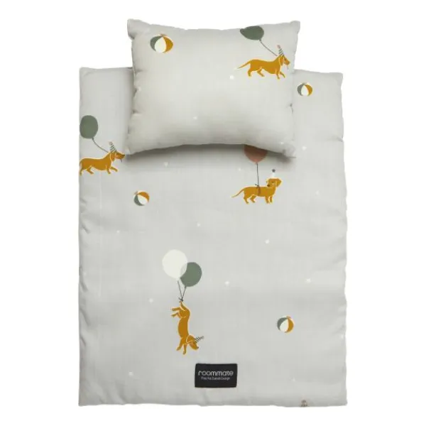 Het Roommate Poppenbeddengoed – Magic Dogs is een schattig setje van een dekentje en kussentje, perfect voor elk poppenbedje. Gemaakt van zacht biologisch katoen met een vrolijke print van hondjes en ballonnen. Ideaal voor uren speelplezier!
