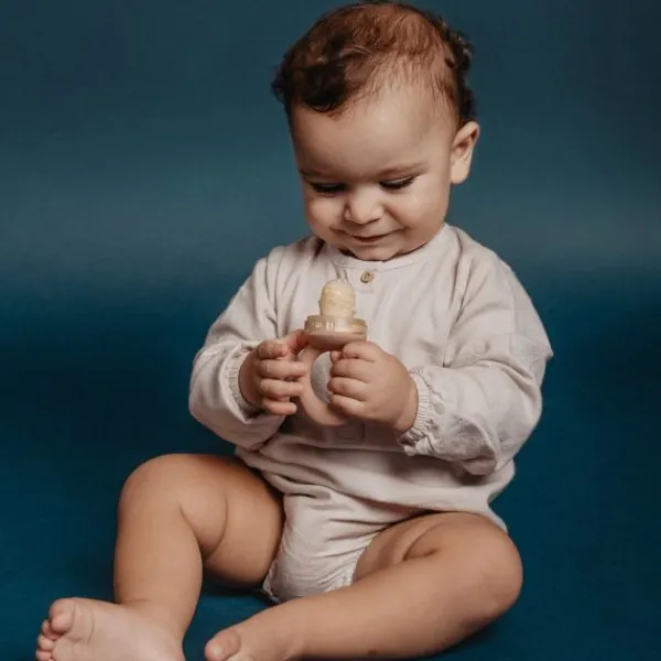 De zachte silicone speen is voorzien van fijne openingen waardoor alleen kleine stukjes voeding doorkomen. Zo wordt het risico op verslikken sterk verminderd. Het ringvormige handvat is makkelijk vast te houden door kleine babyhandjes en stimuleert de ontwikkeling van de fijne motoriek. Dankzij de meegeleverde beschermkap blijft de fopspeen hygiënisch tijdens het meenemen of bewaren.