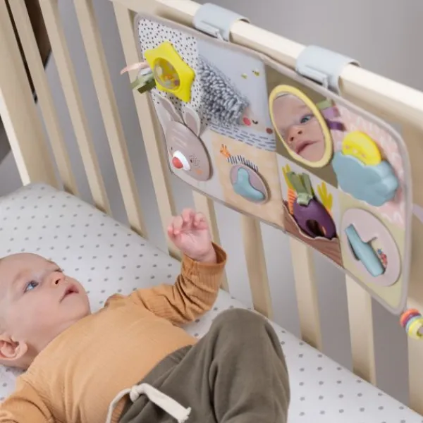 Het Taf Toys Urban Garden Activity Center zit vol met 13 leuke activiteiten die je kindje kan ontdekken! Het centrum is te gebruiken in verschillende levensfases van je kindje. De volgende ontwikkelingsactiviteiten zijn te vinden op de speelmat: muziek en lichtgevend konijntje, kiekeboe-activiteiten, een ster met kleurrijke lintjes en een rammelend balletje, een ratelrupsje, baby spiegel, een doolhof met kleurrijke ringetjes, een egel met een zachte structuur en een bijtring in de vorm van een biet. Door hiermee te spelen ontwikkelt je kindje zijn of haar fijne en grove motoriek en oog-handcoördinatie. Verder kan het activiteitencentrum eenvoudig aan de zijkant van de wieg of box worden bevestigd.