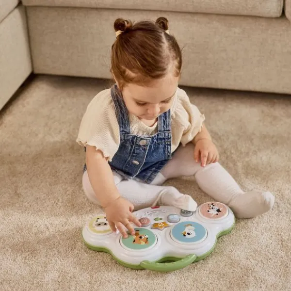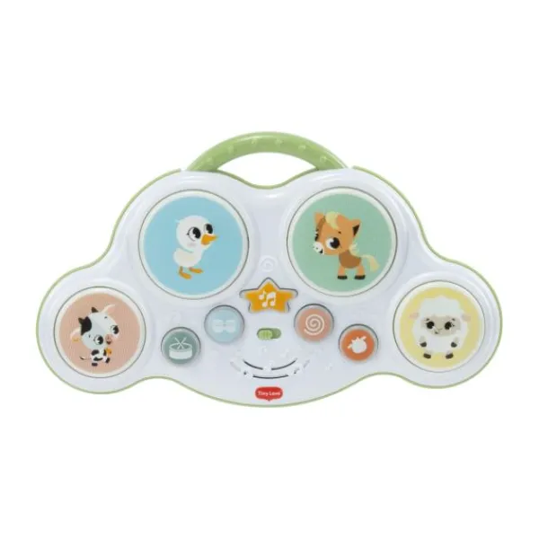 De Tiny Love Farmers Funday Drums zorgen voor muzikaal plezier en leerzame interactie voor de allerkleinsten. Deze vrolijke elektronische drums in wolkvorm is speciaal ontworpen voor nieuwsgierige kindjes. Met vier grote, zachte drumvlakken, elk versierd met een schattig boerderijdier, leren kindjes spelenderwijs dierengeluiden, muziektonen en ritmes herkennen.