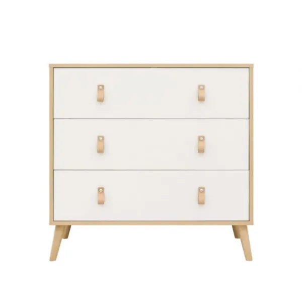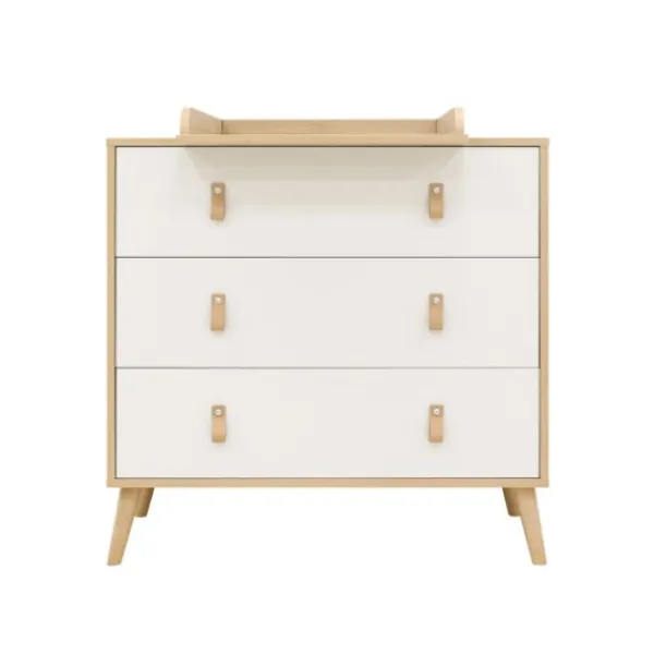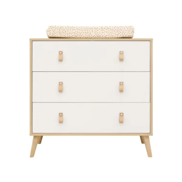 Deze stevige commode beschikt over drie ruime lades, elk voorzien van een soft-close systeem. Hierdoor sluiten de lades geruisloos en veilig, ideaal wanneer je je kindje aan het verschonen bent. De slanke beukenhouten poten geven het meubel een luchtige uitstraling en zorgen voor een stabiele basis. De lades bieden voldoende opbergruimte voor luiers, kleertjes en andere verzorgingsproducten, zodat je alles altijd binnen handbereik hebt.