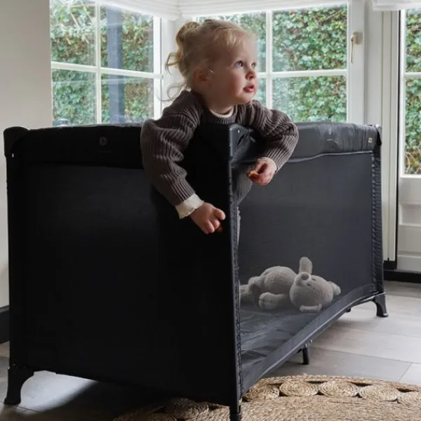 Het Topmark Campingbedje – Charlie – Black is een praktische en stijlvolle oplossing voor logeerpartijtjes of vakanties met je kleintje. Dankzij het lichte gewicht en het compacte formaat is dit reisbedje eenvoudig mee te nemen en snel op te zetten. Het strakke ontwerp in de kleur zwart past perfect in elke ruimte, terwijl het ook functioneel blijft dankzij de slimme details. De lange zijdes van het campingbed zijn volledig uitgevoerd met luchtdoorlatend gaas, wat zorgt voor optimale ventilatie en zicht op je kindje. Ook aan het hoofdeinde is een gaasstrook aangebracht, zodat je kindje altijd frisse lucht krijgt en jij hem of haar goed in de gaten kunt houden. Hierdoor biedt het bedje zowel comfort als veiligheid. Het Topmark Charlie reisbed wordt geleverd met een dun bodemmatrasje en een handige transporttas, waardoor je het bed eenvoudig mee kunt nemen in de auto of het openbaar vervoer. Houd er wel rekening mee dat het standaard matrasje vrij dun is. Als je kindje vaker of langer in het campingbedje slaapt, raden we aan een aanvullend reisbedmatras aan te schaffen voor extra comfort en ondersteuning. Met een binnenmaat van 120 x 60 cm biedt dit reisbed voldoende ruimte voor kindjes van 0 tot ongeveer 36 maanden (maximaal 14 kg). Ingeklapt is het bedje compact op te bergen en gemakkelijk te vervoeren, ideaal voor onderweg of bij opa en oma thuis.