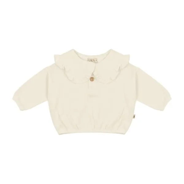 De UAUA Bib Sweater – 3-6 Mnd – Crema biedt een perfecte combinatie van comfort en romantische elegantie voor baby’s van 3 tot 6 maanden. Deze trui met lange mouwen is voorzien van een stijlvolle kraag die een verfijnde uitstraling geeft. Het is een veelzijdige keuze, geschikt voor zowel dagelijks spelen als speciale gelegenheden.