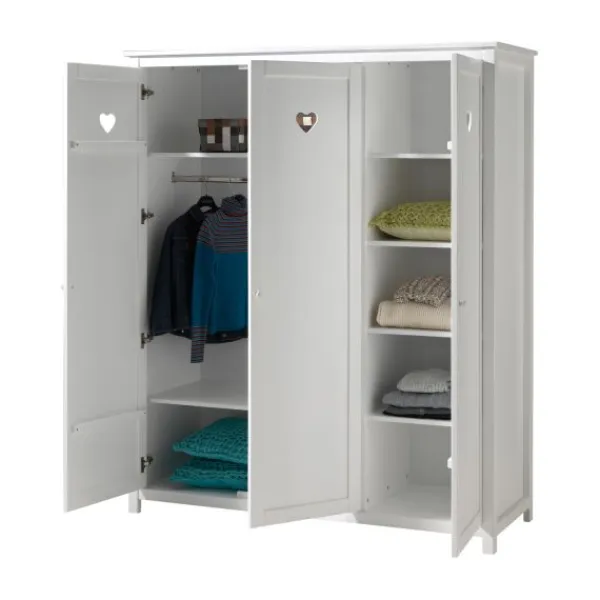 De Vipack Amori Kledingkast Wit 3-Deurs is een kwalitatieve kast in een romantische uitvoering. De kast is gemaakt van kwalitatief MDF en op de fronten van de deuren bevinden er geïntegreerde hartjes die deze serie kenmerken. De kast wordt geleverd met zes legplanken en een hangroede.