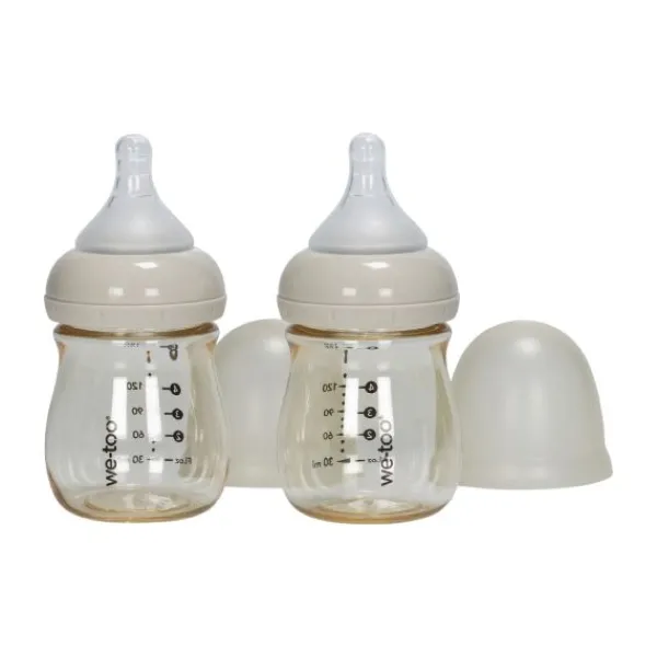 De We-Too Standaardfles PPSU – 160 ml – Black – 2-pack is de perfecte fles om je kindje dagelijks mee te voeden. De fles is ergonomisch ontworpen wat het makkelijker maakt om de fles te geven en om moeiteloos schoon te kunnen maken. De fles is vrij van bisfenol A en Ftalaten. Daarnaast is de fles hitte bestendig tot 180 graden. Verder is de fles verkrijgbaar in verschillende kleuren en groottes. De fles wordt standaard geleverd met een stage 1 speen, geschikt voor 0+ maanden.
