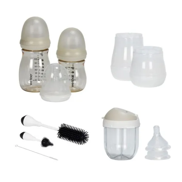 Met de We-Too Starterset – Oatmeal ben je van alle gemakken voorzien bij het voeden van je kindje. De starterset bestaat uit 160 ml fles (incl. stage 1 speen) , een 260 ml fles (incl. stage 1 speen), één stage 0 speen, 2 stage 2 spenen, een schoonmaakset, een poederbus, een fles isolator van 160 ml en een fles isolator van 260 ml. De fles is ergonomisch ontworpen wat het makkelijker maakt om de fles te geven en om moeiteloos schoon te kunnen maken. Verder is de fles is vrij van bisfenol A en ftalaten. Daarnaast is de fles hitte bestendig tot 180 graden.