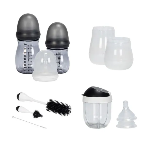 - – Inhoud: 1 fles 160 ml incl. stage 1 speen, 1 fles 260 ml incl. stage 1 speen, 2 stage 0 spenen, 2 spenen stage 2, schoonmaakset, poederbus, fles isolator 160 ml en een fles isolator 210 ml.