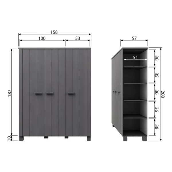 De Woood Dennis Kledingkast Betongrijs 3-Deurs is een mooie kast wat is gemaakt van grenenhout in een geborstelde afwerking. Deze afwerking zorgt ervoor dat de oneffenheden, scheurtjes en noesten extra zichtbaar zijn zodat er een robuuste look ontstaat. Daarom is elk exemplaar van deze serie uniek. De indeling van de kast bestaat uit 1 grote legplank, 5 kleine legplanken en een hangroede. Een praktische kast waar je lang mee vooruit kan.